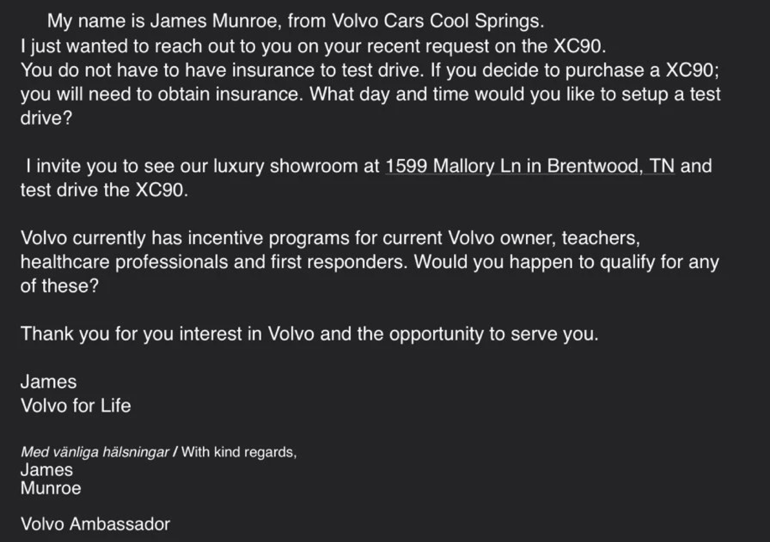 볼보는 매우 적극적으로 시승에 따로 자동차보험 없어도 되고, 테스트 드라이브 언제가 좋겠냐고 답장이 왔다.