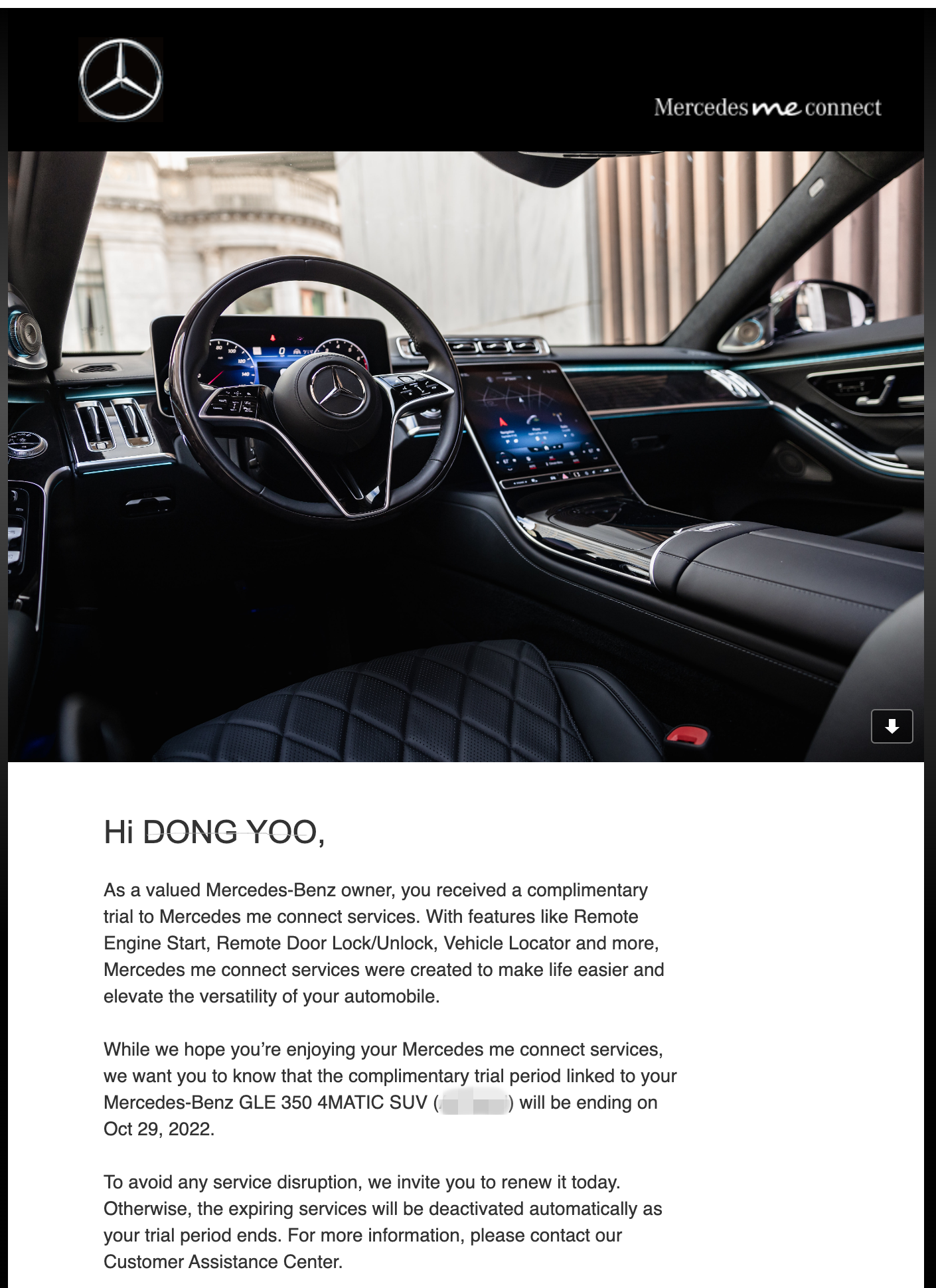 간단하게 당신의 차의 벤츠의 APP등 아름다운 서비스가 곧 끝나니 1년 더 연장하세요. 라고 정중하게 나에게 알림을 준 것이다.